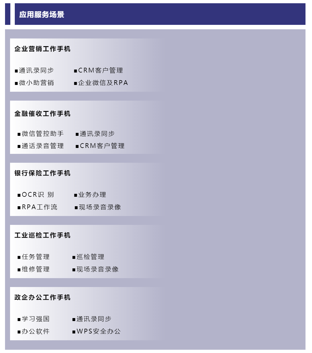 通过对终端设备的不同管控方案,基于行业应用APP实现不同场景的移动工作站应用。