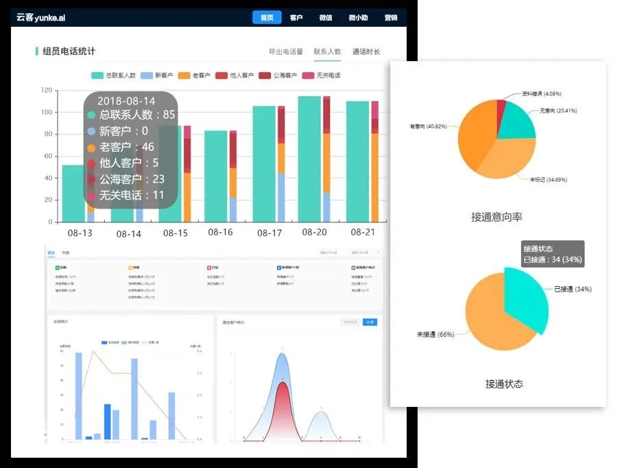 在云客手机的销售业务可视化中心,管理者随时随地查看关键数据信息,话务、微信、好友、敏感词等多维数据,可视化报表,将销售工作量化,结合历史数据,预测分析,驱动决策。