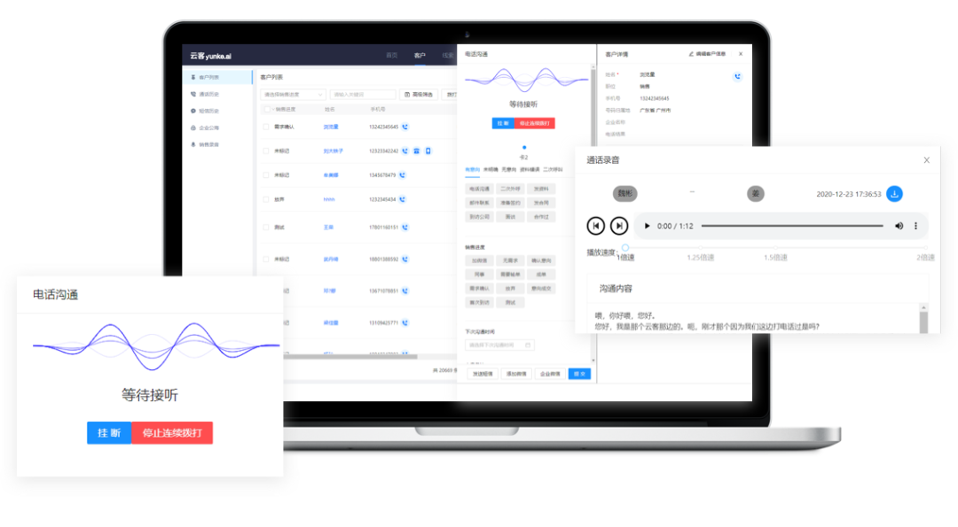 云客工作手机不仅记录全部销售行为,更对沉淀录音及微信及企业微信内容分析,发现沟通问题,找到优秀话术,提示沟通技巧,提高销售转化。同时,系统展现客户跟进的全过程,分析学习销冠跟进模式,提升团队整体战斗力,降低企业的获客成本。