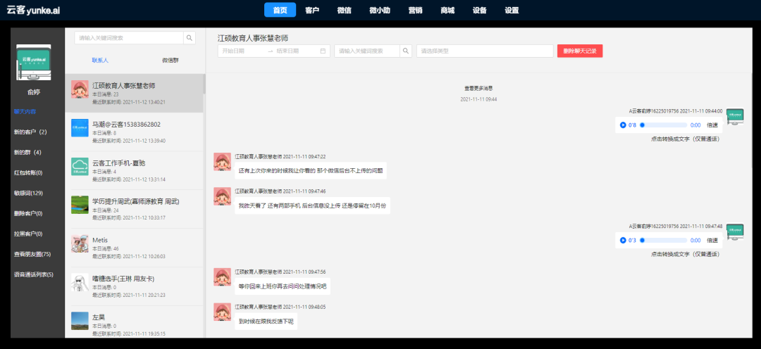 销售人员无论使用电话,还是微信、企微、QQ等与客户沟通,管理者都可对销售的聊天内容一览无余。员工敏感操作全部留痕,如发生删除客户、发红包、拉黑客户、转账等行为,出现敏感操作系统会及时提醒,维护企业形象。同时,系统支持AI质检,让质检更加高效、智能,检测更快,成本更低。