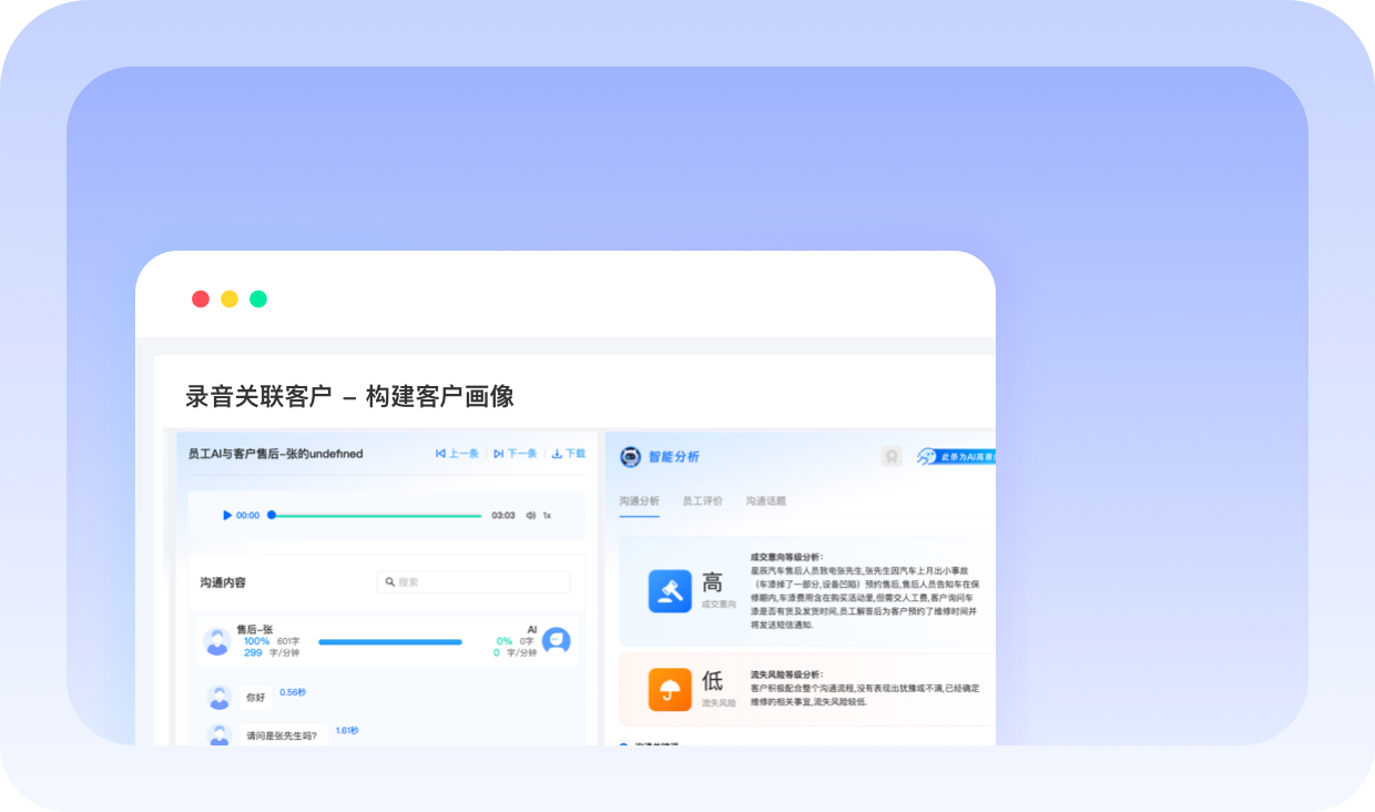 AI 智能识别员工与客户角色,分析沟通摘要,刻画客户画像(如理财偏好、风险承受能力),辅助员工推荐适配的金融产品;智能质检员工是否按 SOP 流程介绍产品风险、收益说明等关键信息,是否使用违规话术(如 “保本保息”),实时输出质检报告,规范服务行为。