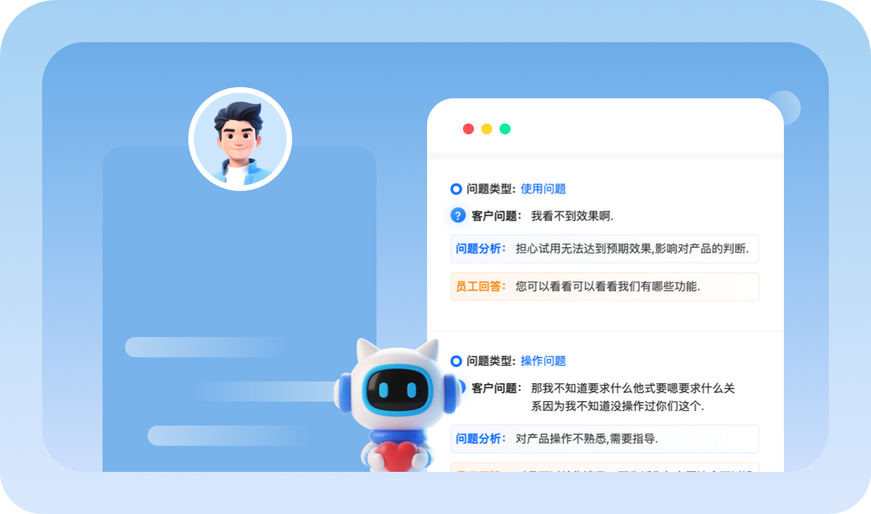 AI自动提取需求/偏好/疑问,构建精准客户画像。多维分析成交意向、关注点、潜在需求与顾虑,输出洞察建议,辅助精准服务。