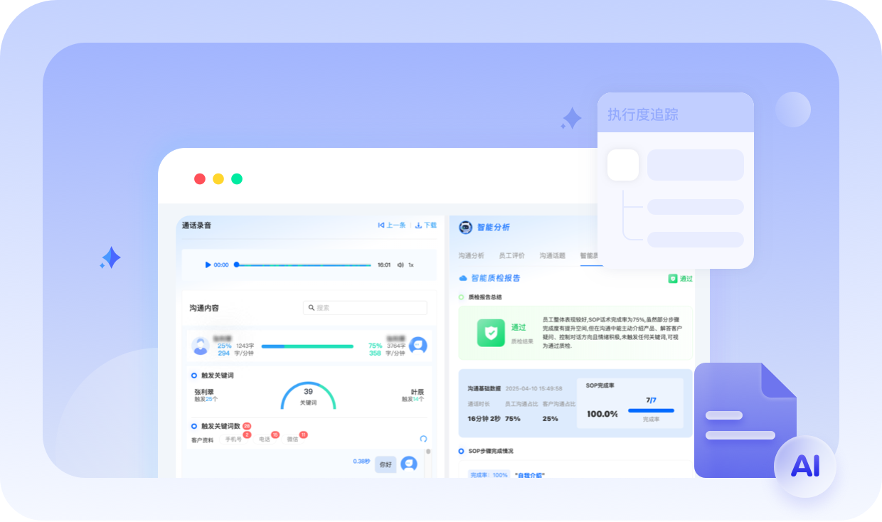 AI自动扫描服务录音,精准识别SOP偏差、话术风险及态度异常,生成质检报告。实现过程全面监管,提升质检覆盖率,缩短整改时效。