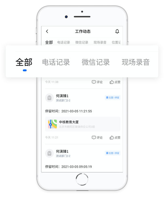员工电话记录、微信记录、销售录音、位置记录、客户变更等情况,以朋友圈信息流的形式展现,销售的每一步动态,管理层实时了解,并能及时给出指导意见。