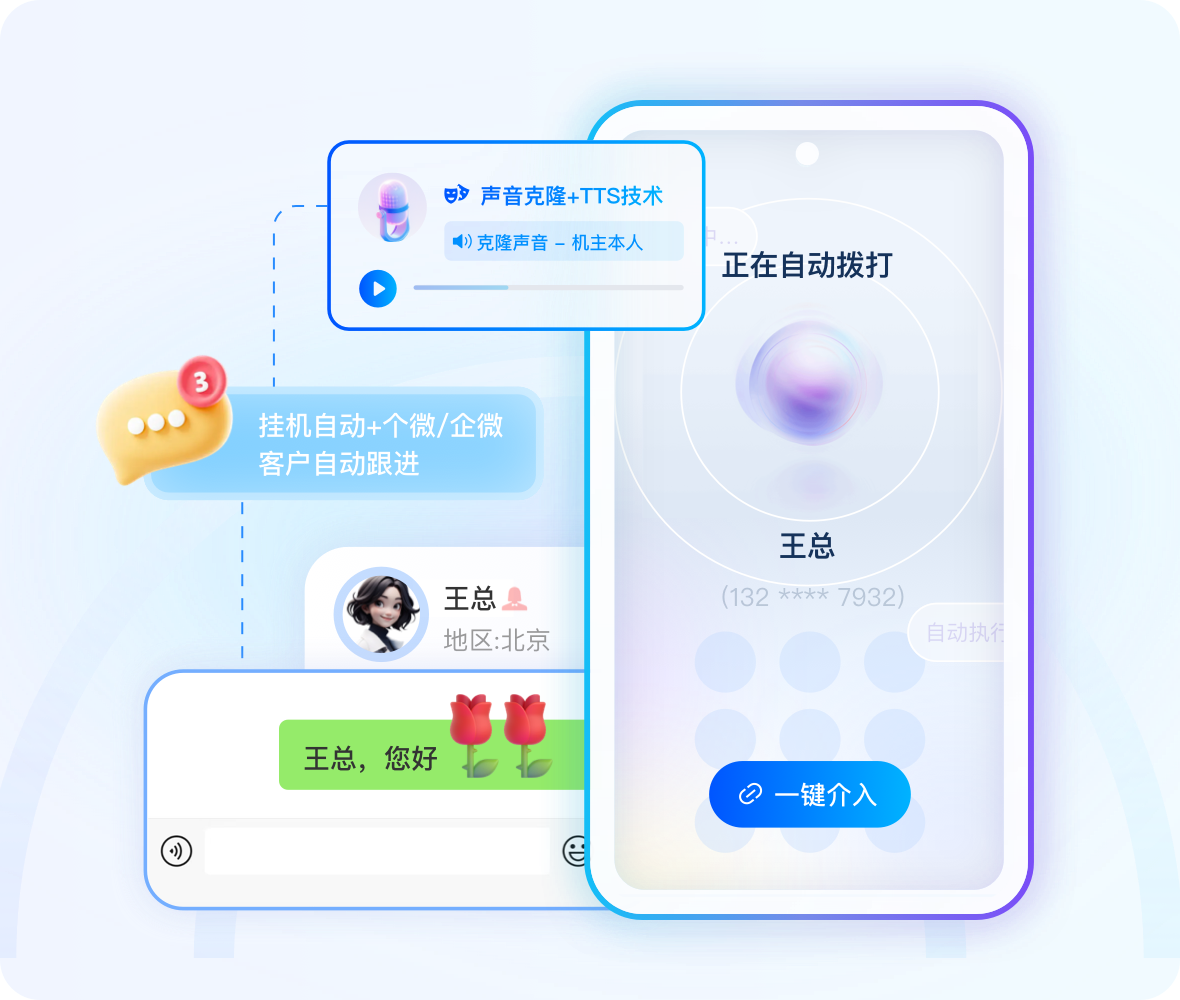智能外呼触达,风险号自动调整,支持微信/企业微信双注册。