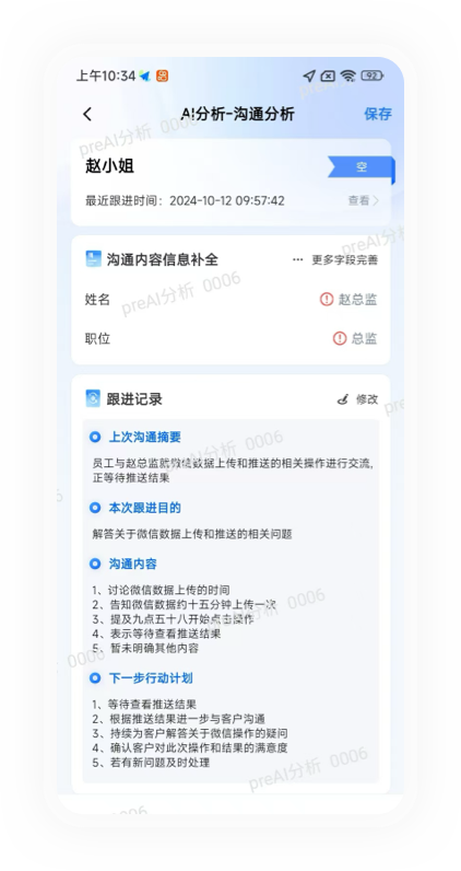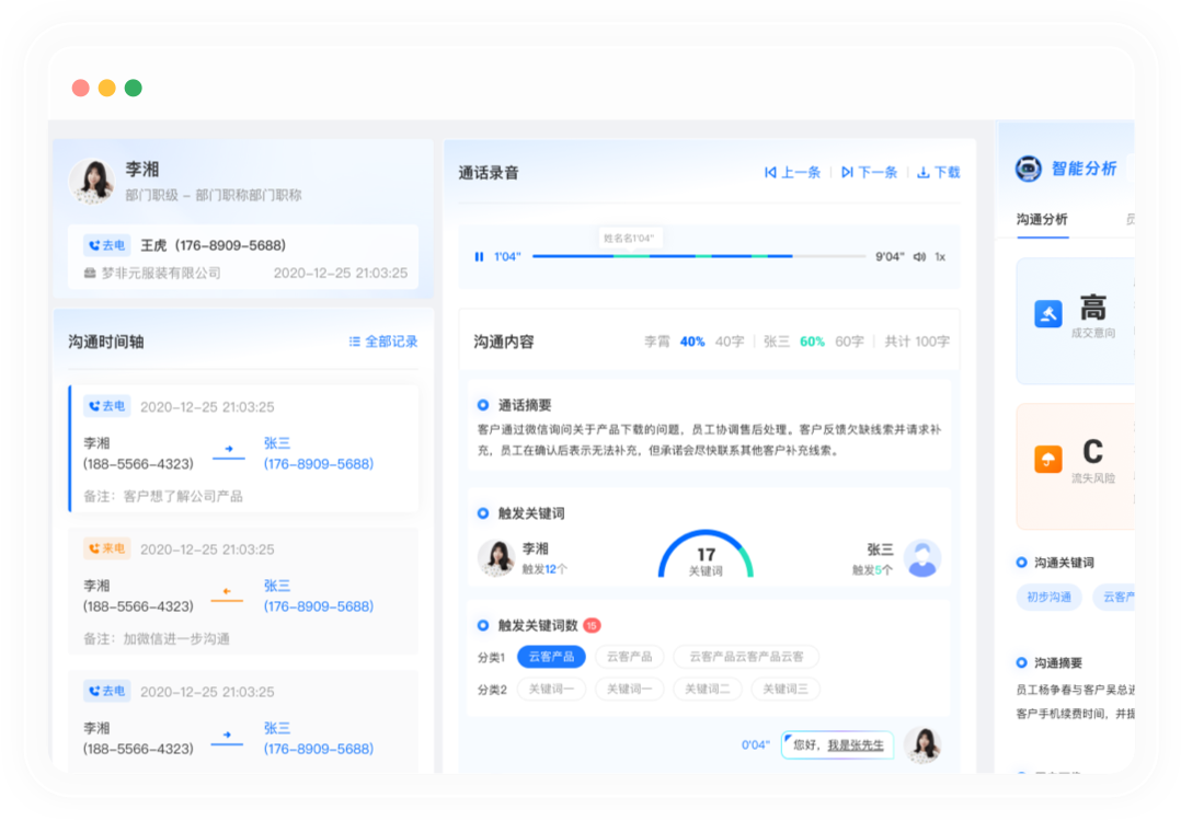 自动生成记录,补全客户标签快速筛选意向客户,节省时间推荐行动方案,优化销售流程