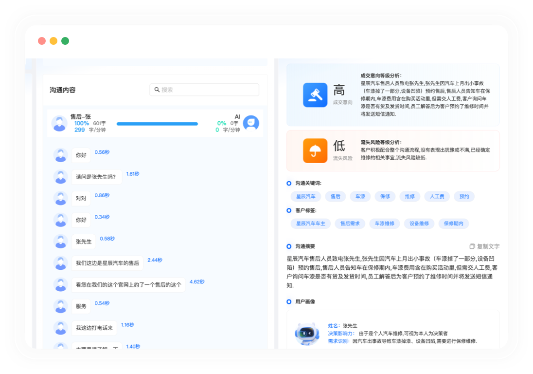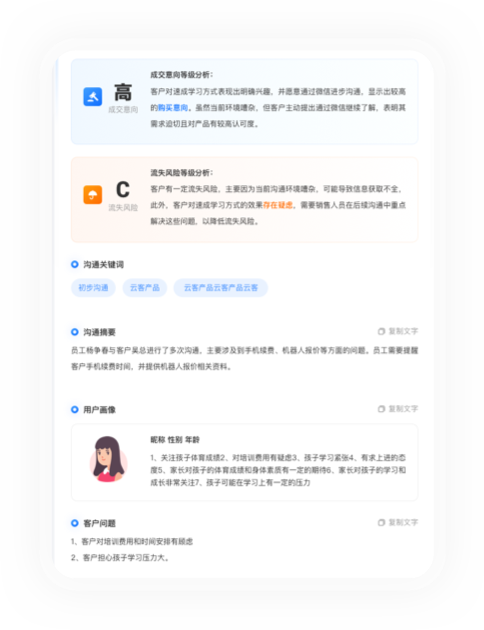 识别流失风险,实时预警分析异议点,生成解决方案推荐跟进话术,挽回高价值客户