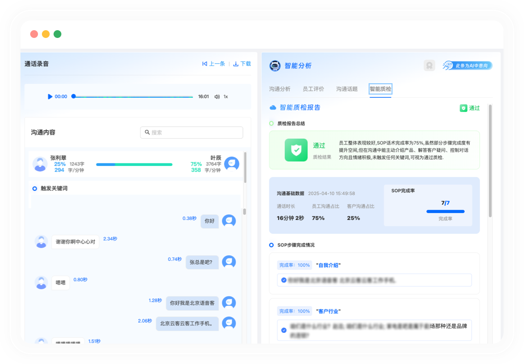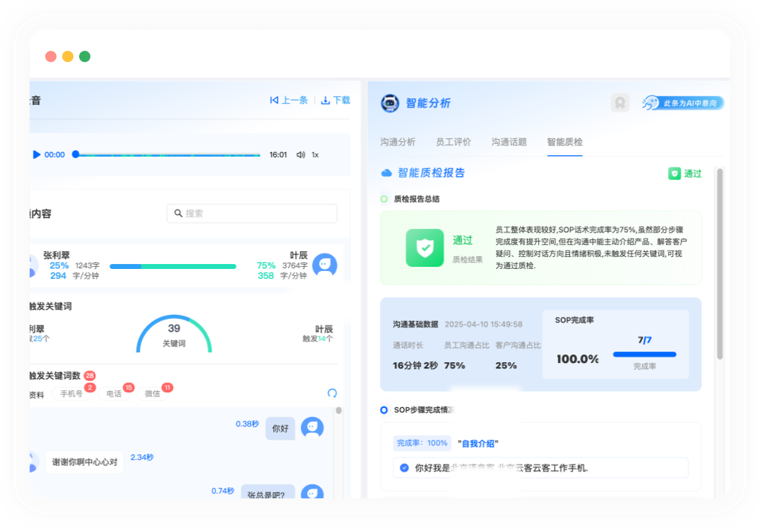 监测竞品信息,防范私单识别违规话术,生成质检报告预警异常行为追踪客户情绪
