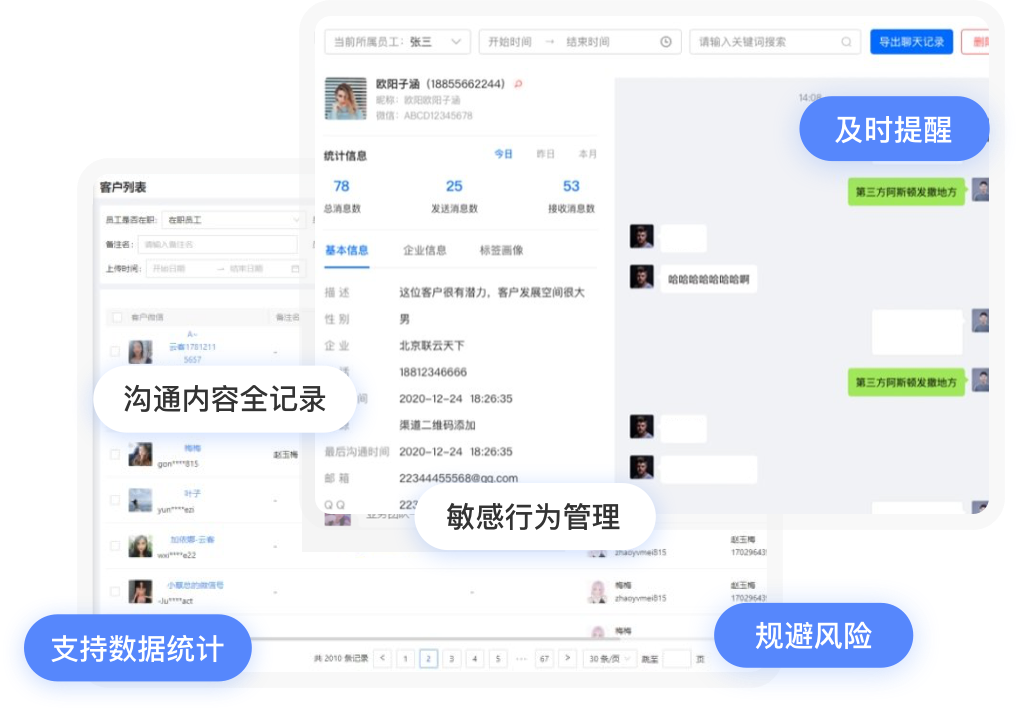 检测辱骂客户、夸大承诺等敏感词,自动删除,自动记录统计