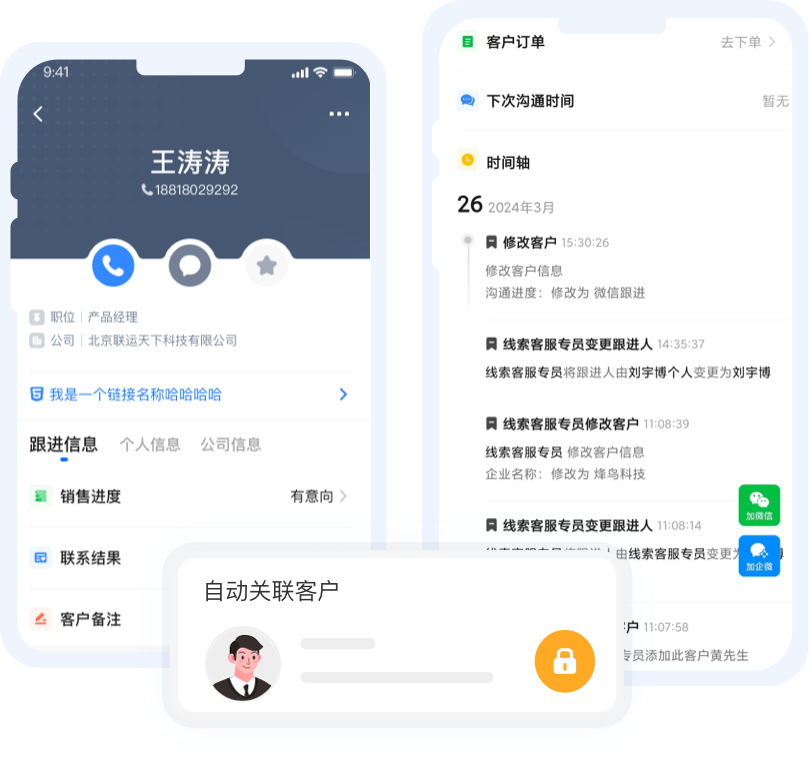 客户详情、时间轴、个人信息等内容自动关联;微信客户信息自动匹配