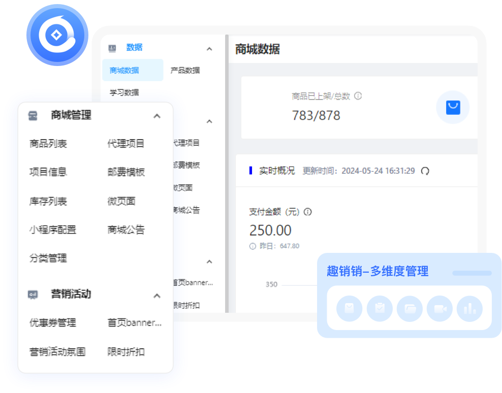 支持自定义产品模板、佣金设置、小程序展示页面、优惠券、营销活动等商城管理