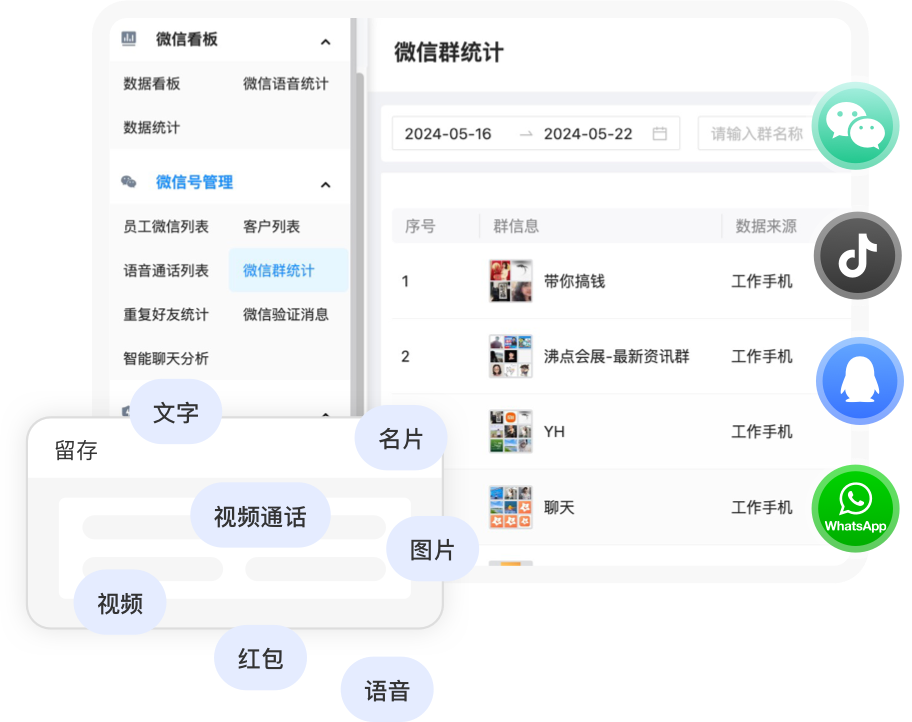 支持微信、企微、抖音/极速版、QQ、WhatsApp等平台的沟通数据留存